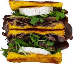 Pastrami, rúcula, queso rulo de cabra, cebolla caramelizada, mayonesa y mostaza dulce.