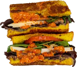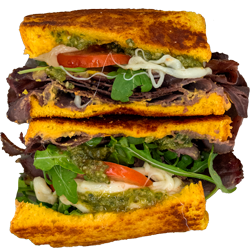 Pastrami, rúcula, tomate, queso mozarella y salsa pesto.
