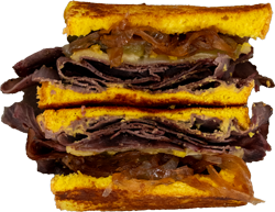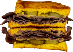 Pastrami, queso cheddar ahumado, pepinillos y mostaza alemana.