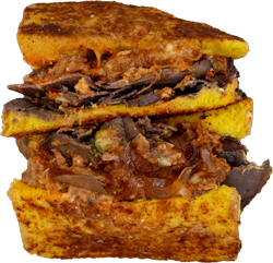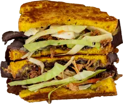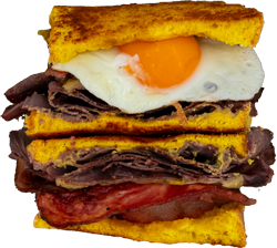 Pastrami, huevo frito, queso cheddar, bacón y salsa de miel y mostaza.