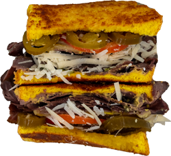 Pastrami, pepinillos, queso cheddar, cebolla caramelizada, salsa de mostaza y queso fresco.